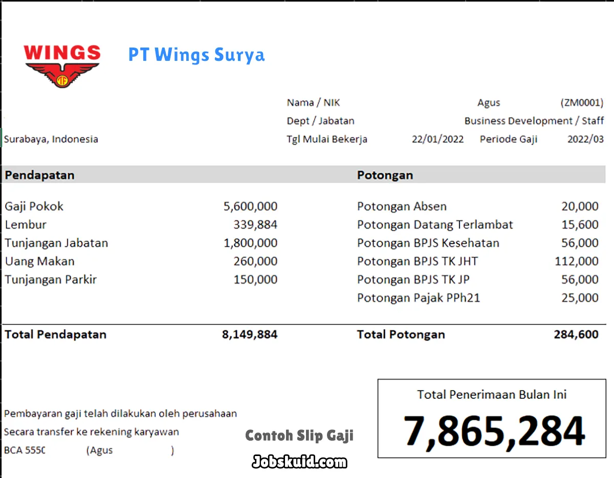 Gambar di atas adalah contoh slip gaji PT Wings Surya. Slip gaji tersebut memuat informasi seperti gaji pokok, gaji lembur, bonus, tunjangan, potongan, dan total gaji.