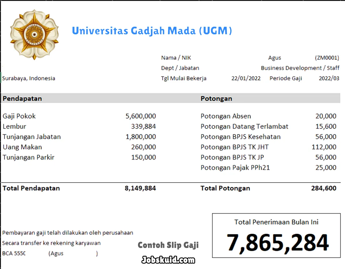 Gambar di atas adalah contoh slip gaji Universitas Gadjah Mada (UGM). Slip gaji tersebut memuat informasi seperti gaji pokok, gaji lembur, bonus, tunjangan, potongan, dan total gaji.