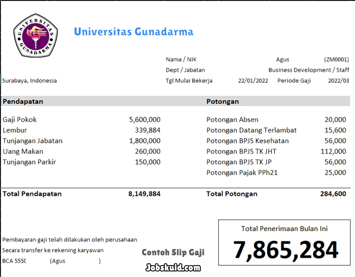 Gambar di atas adalah contoh slip gaji Universitas Gunadarma. Slip gaji tersebut memuat informasi seperti gaji pokok, gaji lembur, bonus, tunjangan, potongan, dan total gaji.